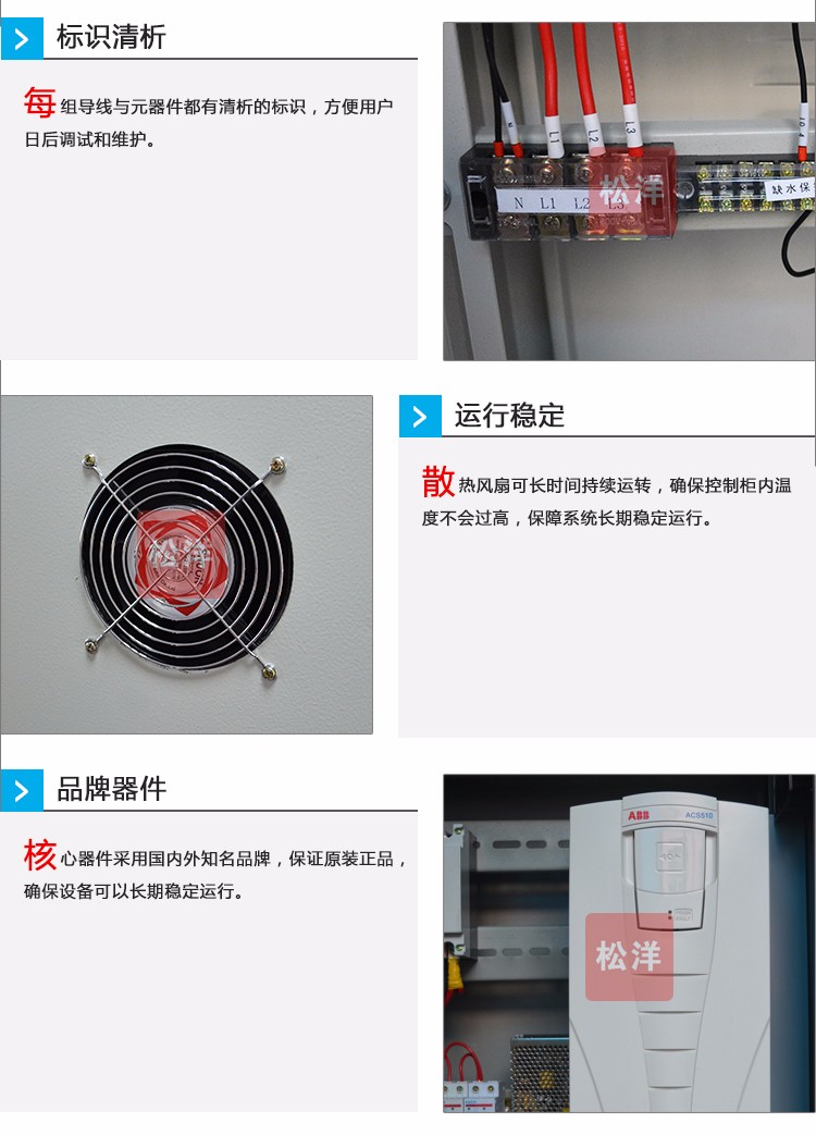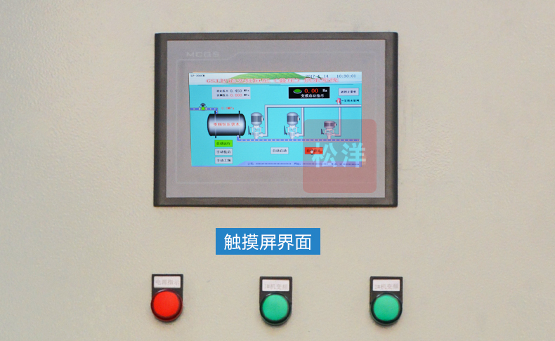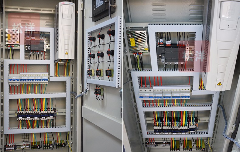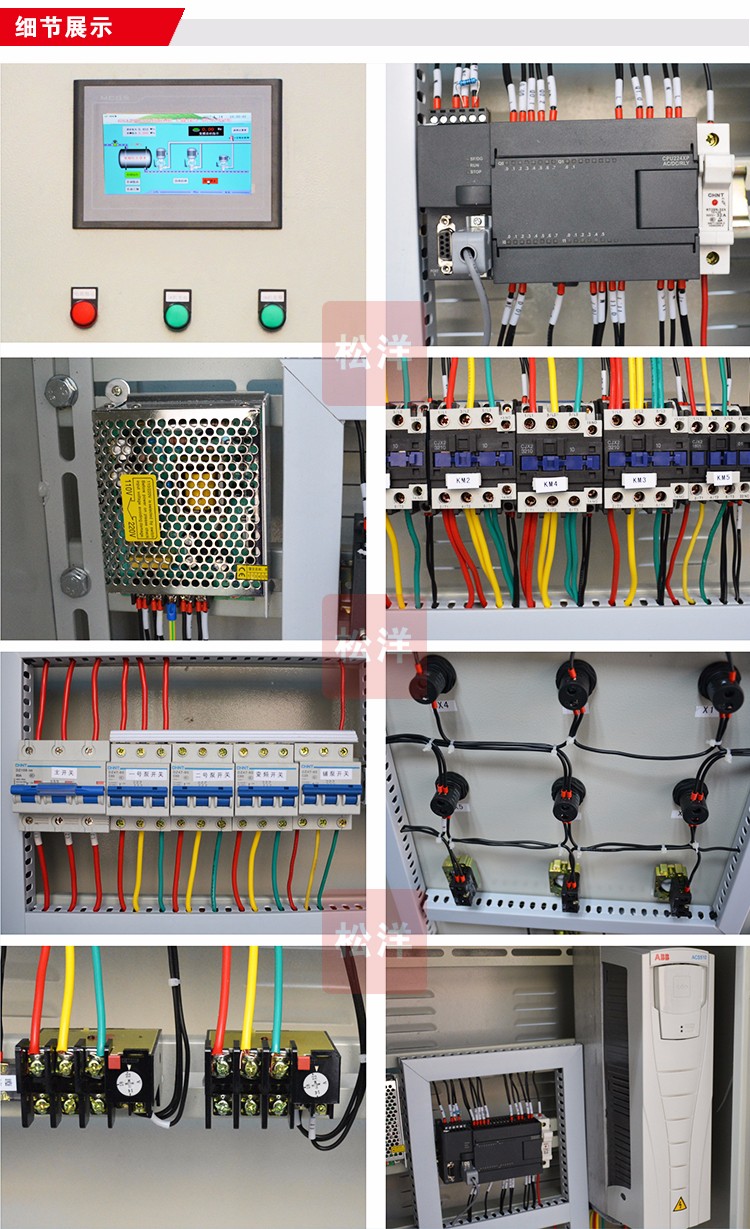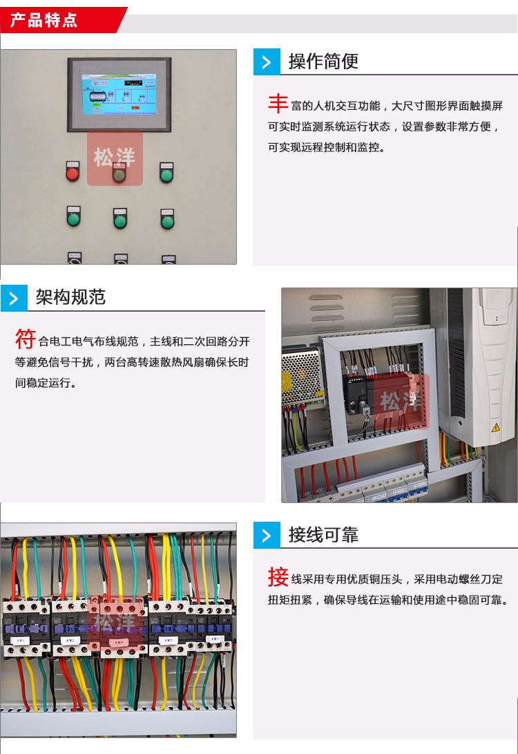 節(jié)能型恒壓供水控制柜,采用優(yōu)質(zhì)冷扎鋼板、框架 式標準件結(jié)構(gòu),符合電工電氣布線規(guī)范,主線和二次回路 分開避免信號干擾。具體豐富的人機交互功能,控制面板 集成了電流表、電壓表、觸摸屏、指示燈、快捷操作按鍵 等,操作起來十分簡便。